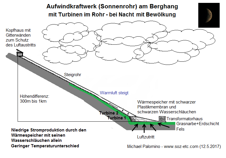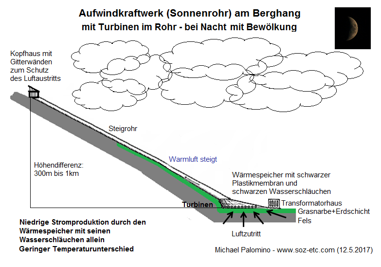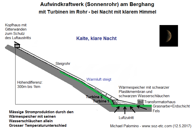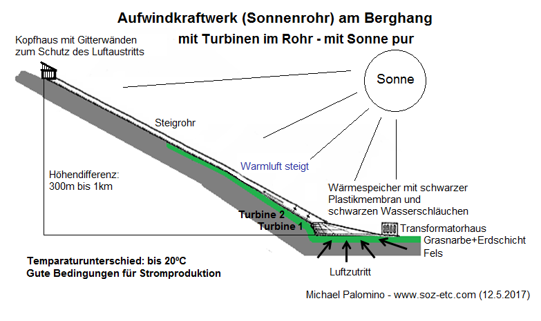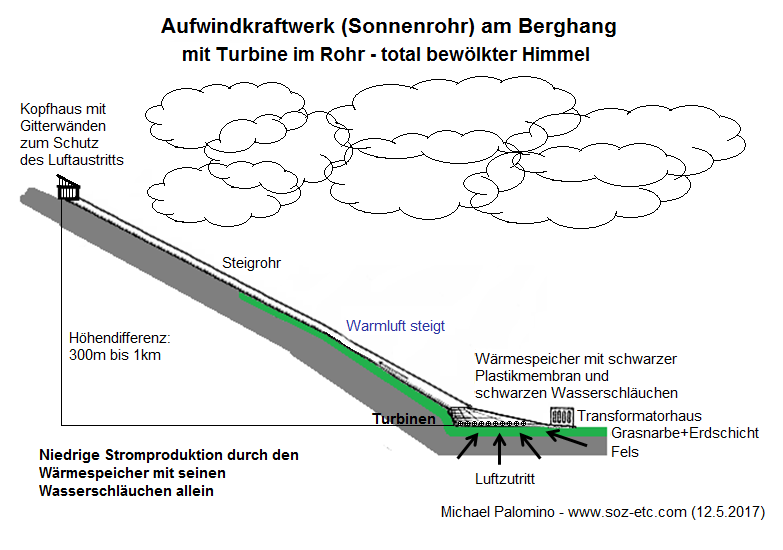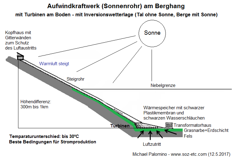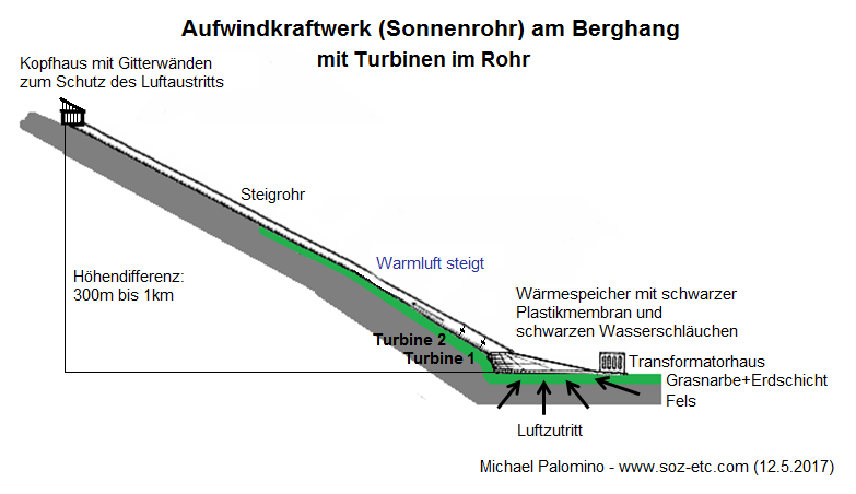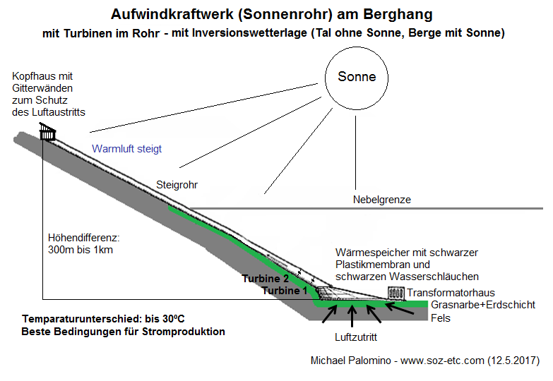 Die Röhre kann bis 5m Durchmesser haben, mehr nicht, sonst kann man sie in den Bergen nicht montieren. Generell kann jedes Bergtal mit mittlerer Sonneneinstrahlung solch ein Aufwindkraftwerk (Sonnenrohr) an einen Berg bauen. Man kann die Rohre dunkelbraun anstreichen, so dass sie bei Inversionswetterlage auch warm werden. Man kann die Rohre auch aufschütten, so dass sie vor starkem Frost geschützt sind. Man kann auch das letzte Ende der letzten 100m freilassen, damit bei Inversionswetterlagen das Rohr warm wird und so ein Luftsog gefördert wird. Das ist alles noch unerforschtes Gebiet und muss man alles ausprobieren.
