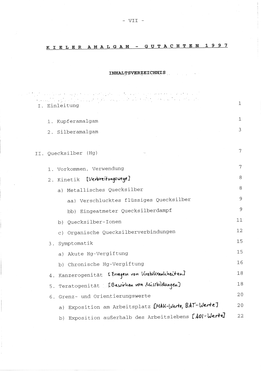 Da ganze Universitätsverbände (z.B. in der dummen Schweiz, die immer kränker wird) das Amalgam-Gutachten gar nicht in den Regalen haben, fühle ich mich verpflichtet, es im Internet zu publizieren, damit die Menschen, die betroffen sind, sich in der ganzen Welt darauf beziehen können. Quelle war eine Ausgabe des Kieler Amalgam-Gutachtens von der Universität Karlsruhe: "Kieler Amalgam-Gutachten 1997; Medizinische, insbesondere toxikologische Feststellungen im Zusammenhang mit einer rechtlichen Beurteilung der Herstellung und des Vertriebs von Amalgam als Material für Zahnfüllungen. Prof. Dr. O. Wassermann, M. Weitz, Priv. Doz. Dr. C. Alsen-Hinrichs, unter Mitarbeit von Dr. Sibylle Mai. Institut für Toxikologie im Klinikum der Christian-Albrechts-Universität zu Kiel, Brunswiker Strasse 10, 24105 Kiel; 2. Auflage, Kiel 1997; Badische Landesbibliothek Karlsruhe, Signatur 98 B 985. Wenn die ganze Welt nur noch Keramikfüllungen legen würde, dann würde die Keramik viel billiger, und die Menschen würden viel gesünder leben. Gleichzeitig würden die Gewässer auch kaum noch mit Quecksilber und anderen Metallen vom Amalgam verseucht, wie dies heute tagtäglich passiert, (ohne dass es jemand sagt). All dies wollen die Regierungen bis heute leider nicht merken, und die Chemie will das auch nicht, dass jemand etwas merkt, denn dann wären die Menschen ja viel weniger krank und würden weniger Medikamente kaufen, z.B. von den schweizer Pharma-Pitbulls Roche und Novartis, in Deutschland von Hoechst, in den "USA" von Pfitzer etc. ... Michael Palomino 2007 Kapitel Hinweise der Autoren - (der Auftrag für die Studie - die Verweigerung der Publikation der genauen Resultate) I. Einleitung - (verschiedene Amalgammischungen - Widersprüche) Kupferamalgam - Silberamalgam - Widersprüche - Absicht des Verbots 1994 1.1. Kupferamalgam S.1 1.2. Silberamalgam S.3 II. Quecksilber (Vorkommen und Wirkungen) Vorkommen und Verwendung - die Wirkungen von Quecksilber im menschlichen Organismus - Hg-Dampf und Hg-Verbindung Methylquecksilber - Symptome bis zur Fehlgeburt 2.1. Vorkommen, Verwendung S.7 2.2. Kinetik [Verbreitungswege] S.8 a) Metallisches Quecksilber S.8 aa) Verschlucktes flüssiges Quecksilber S.9 bb) Eingeatmeter Quecksilberdampf S.9 b) Quecksilber-Ionen S.11 c) Organische Quecksilberverbindungen S.12 2.3. Symptomatik S.15 a) Akute Hg-Vergiftung S.15 b) Chronische Hg-Vergiftung S.16 2.4. Kanzerogenität [Erregen von Krebskrankheiten] S.18 2.5. Teratogenität [Bewirken von Missbildungen] S.18 2.6. Grenz- und Orientierungswerte S.20 a) Exposition am Arbeitsplatz [MAK-Werte, BAT-Werte] S.20 b) Exposition ausserhalb des Arbeitslebens [ADI-Werte] S.22 III. Toxisch bedingte Gesundheitsschädigungen durch Silberamalgam S.23 3.1. Frühzeitiger Kenntnisstand z.B. der Degussa AG S.24 [Warnungen von Degussa-Sprecher Loebich 1955 (S.25-27)] 3.2. Frühzeitige Bestätigung dieses Kenntnisstandes durch die wissenschaftliche Fachliteratur S.27 [Warnungen Fleischmann 1928, Stock 1928 (S.28); Warnungen Stock 1926, 1939 (S.30); Warnung Maschke 1930 (S.31-32); W. Borinski 1931 (S.32-36); W. Rheinwald 1954, 1955 (S.36); Warnung Schmitt 1955 (S.37); Warnung Thielemann 1954 (S.37); Warnung Wannenmacher 1929 (S.38); Warnung Fühner 1927 (S.39)] 3.3. Kenntnisstand auf seiten der Amalgamhersteller in der jüngeren Vergangenheit [ab Loebich 1955] (S.40) 3.4. Bestätigungen dieses Kenntnisstandes in der jüngeren wissenschaftlichen Zahnmedizin und in der weiteren Fachliteratur S.42 [Köhler 1958 hält "Fernschäden" fest - Falck / Weikart 1959 stellen den Hg-Dampf 24 Stunden pro Tag fest - Gmelins Handbuch stellt "chronische Vergiftungen" fest - Warnung Rheinwald 1962 - Gassers Schema der Amalgam-Krankheiten 1968 - Werbeanzeige von Ögussa und Degussa für Goldfüllungen bei amalgamsensiblen Personen 1993] 3.5. Aktuelle Stellungnahmen zahnärztlicher Standesorganisationen und des Bundesinstituts für Arzneimittel und Medizinprodukte (BfArM) S.48 [Die neue deutsche Fachliteratur der Zahnärzte empfiehlt, Amalgam nur nach schriftlich dokumentierten und vom Patienten unterschriebenen Beratungsgesprächen anzuwenden] 3.6. Aktueller Wissensstand über toxisch bedingte Gesundheitsschädigungen durch Silberamalgam S.50 [Temperatur - Kaubewegungen - Kaugummi - Quecksilberdampf 24 Stunden täglich - Amalgamprüfkörper - "thermische Belastungen" - quecksilberarme Amalgamfüllungen Verstorbener - Zähneknirschen - Schnarchen - Zähnebürsten - Messungen - Föten und Neugeborene bei Amalgammüttern - Kiefer und Dentin - Grenzwerte für Trinkwasser und Raumluft - Immunsystem geschädigt und Antibiotikaresistenzen gefördert] a) Quecksilbermenge im Mund b) Bestätigung des Giftcharakters von Quecksilber auch in der zahnmedizinischen Fachliteratur S.51 c) Quecksilberfreisetzung aus Amalgamfüllungen S.51 d) Quecksilberaufnahme aus Amalgamfüllungen S.57 e) Amalgambedingte Quecksilberbelastungen in S.58 aa) Blut S.59 bb) Urin S.59 cc) Stuhl S.61 dd) Speichel [Faktor Kaugummi] S.62 ee) Atemluft [Faktor Kaugummi] S.64 ff) Organen wie Gehirn, Knochenmark, Leber, Niere u.v.a.m. S.66 gg) Zahn-Mund-Kiefer-Bereich S.71 f) toxikologische Bewertung S.73 aa) Verwendung des Begriffs "Vergiftung" S.73 bb) Zusammenwirken verschiedener Hg-Formen S.74 cc) Kontinuität der Exposition gegenüber Quecksilber aus Amalgamfüllungen S.75 dd) Toxizität täglich in Dampf-Form aufgenommener Hg-Mengen S.75 ee) Bewertung des amalgambedingten Hg-Gehalts im Speichel S.76 ff) Bewertung des amalgambedingten Hg-Gehalts in der Atemluft S.78 gg) ADI-Wert als Kriterium S.81 hh) Orientierungswerte des BGA / BfArM als Kriterien S.82 ii) Bandbreite individueller Reaktionsweisen S.82 jj) Gefahr fetaler [fötaler] und frühkindlicher Schädigungen S.90 3.7. Verarbeitungsfehler (bei Amalgamfüllungen - keine Aufklärung - schwere Körperverletzung durch Amalgam) a) Anfälligkeit des Amalgams gegenüber Verarbeitungsfehlern S.93 [Unbedingte Gründlichkeit ist bei deutschen Ka