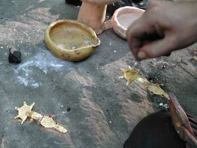 Der Goldsand wird mit Quecksilber versetzt und über eine