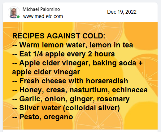 D - ESP - F Natural antibiotics - index Mother Earth can do this ![]() Natural antibiotics [1] - Text: recipes against cold from Dec 19, 2022 [2] by Michael Palomino (since 2022)