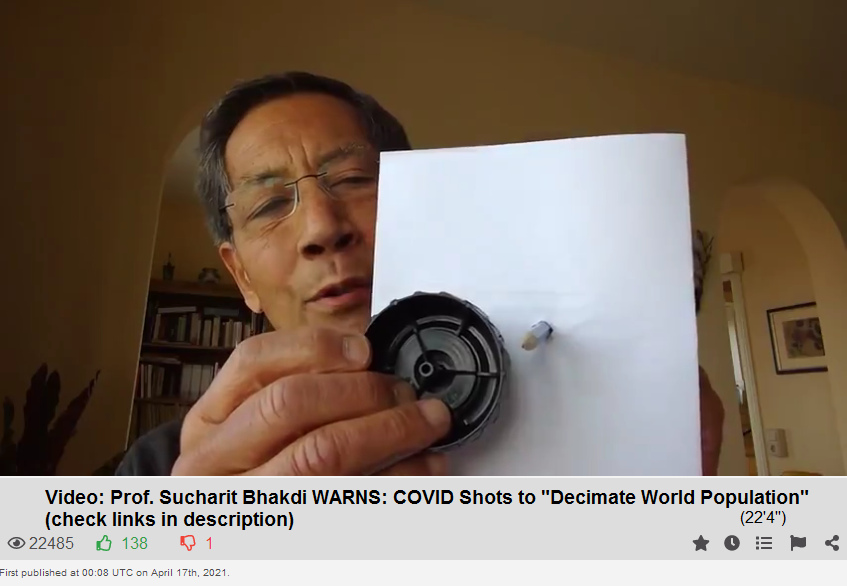 Bhakdi: Glauben Sie das nicht, glauben Sie diese Lüge nicht, Leute (4''), um Gottes Willen (6''), und um Gottes Willen, informieren Sie sich (8''), bevor Sie sich und andere Angehörige sich impfen lassen (12''), denn: Wenn Sie einmal [mit den Gen-Impfungen] geimpft sind (15''), und Leute, lasst euch nie eine dritte, vierte oder fünfte Spritze geben, weil wenn Sie das tun (21''), dann leisten Sie einen Beitrag zur Bevölkerungsreduktion (26'').