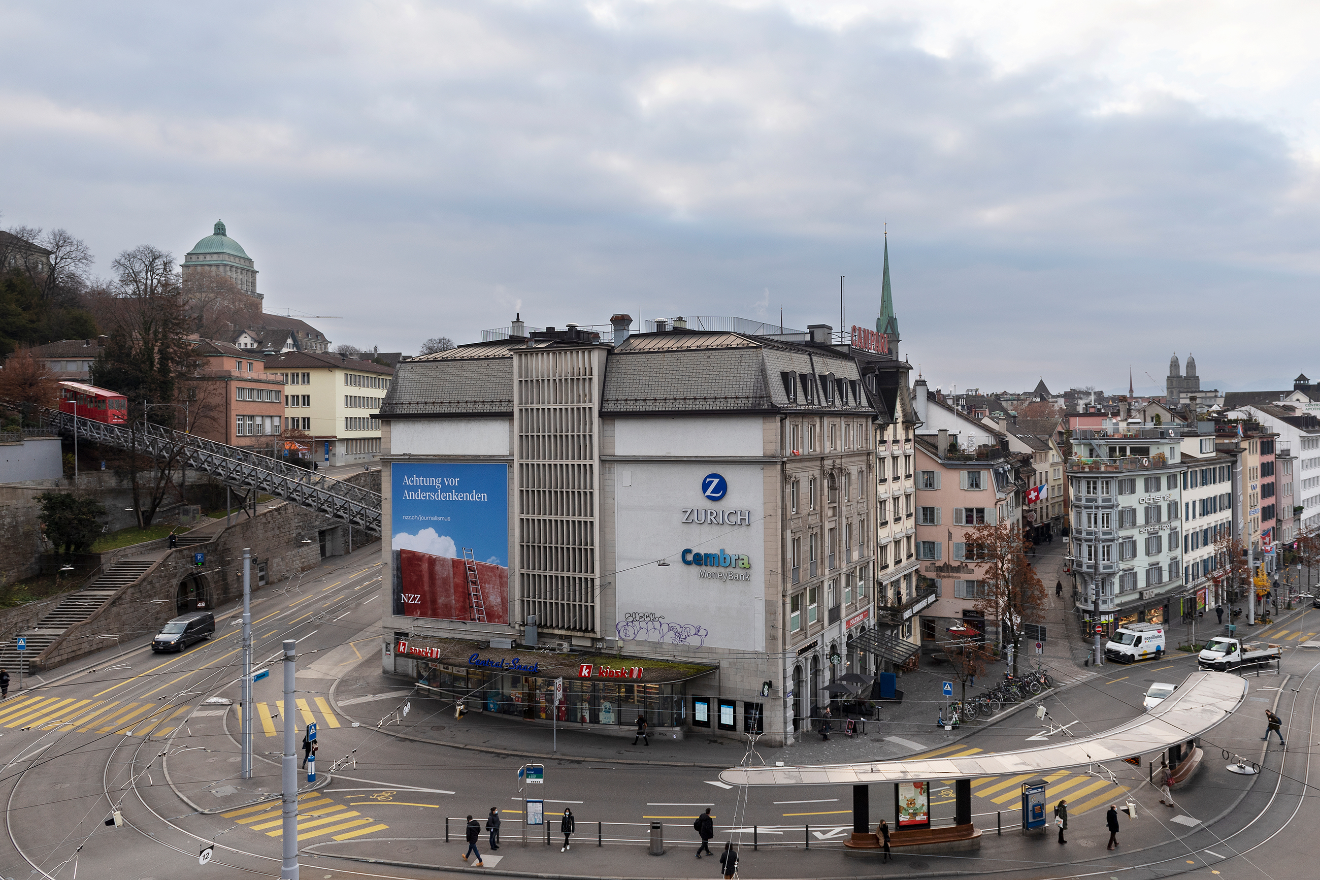 Antidemokratisches Hetzplakat der NZZ am Central in Zürich 3.12.2020: Das Plakat "Achtung vor Andersdenkenden" suggeriert, wer die Wahrheit denkt, würde eine Mauer runterfallen, Zoom [3]
