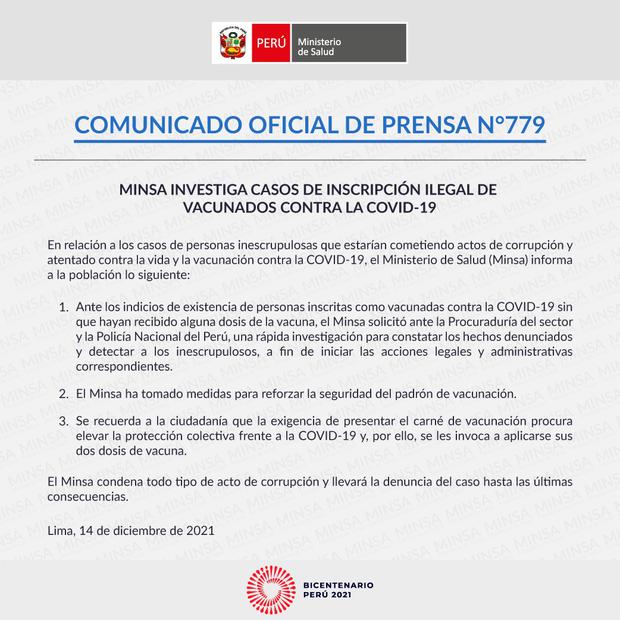 Asimismo, el titular del Minsa señaló que si bien los menores tienen un nivel de complicación “muy bajo” cuando se contagian de coronavirus, hay casos de niños que “se han agravado”. “Son excepcionales, pero existen. Los niños también contagian por eso es importante la vacunación de todo el grupo familiar”, indicó.