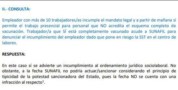 Sin embargo, el laboralista aclaró que Sunafil publicó una ayuda memoria de preguntas y respuestas sobre el tema de vacunación, en el que menciona que no tiene base legal para sancionar.