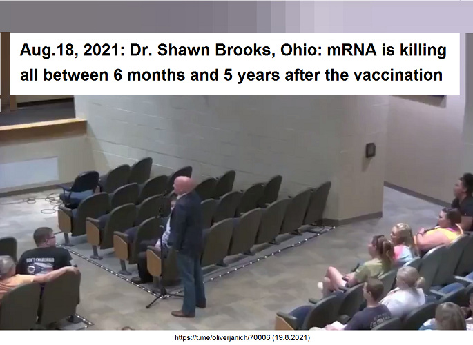 Aug.18, 2021: Dr. Shawn Brooks at Ohio University warns: mRNA is killing all between 6 months and 5 years after the vaccination [8]