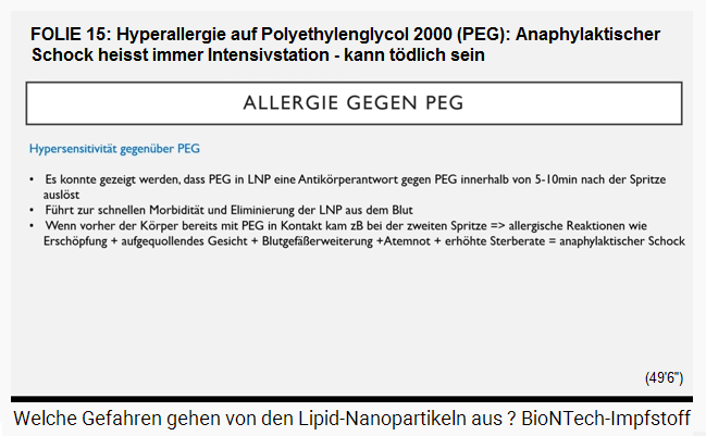 DIAPOSITIVA 15: Hiperallergia al polietilenglicol 2000 (PEG) - shock anafiláctico, puede ser fatalEso significa que las personas con las que he estado en contacto con PEG en algún momento de su vida o en la vida (49'10''); no tengo idea de dónde está eso, tal vez un toxicólogo lo sepa mejor (49'17''), podría ser que esta persona haya desarrollado una respuesta de anticuerpos contra el PEG (49'24''), y si vuelve a entrar en contacto con el PEG en algún momento de su vida, (49'29''), entonces se produce una reacción de hipersensibilidad en 5 a 10 minutos y eso puede ser muy peligroso (49'36''). Entonces hay ... - sí - bueno, estos anticuerpos que se forman contra el PEG, primero que nada, luego se activan (49'47''), las nanopartículas lipídicas que camuflan el PEG luego son atacadas con anticuerpos y con él las nanopartículas lipídicas se eliminan inmediatamente de la sangre (49'59'') y la vacunación es completamente ineficaz (50'2''). Entonces, estas personas, que obtienen esta respuesta inmune, entonces, no se forman más proteínas de pico (50'8''). No puede haber más respuesta inmune (50'10''). Ajá, todo fue en vano (50'13''). Aparte de eso, ahora tienen problemas con su respuesta alérgica (50'18''), es decir aquí las reacciones, son reacciones alérgicas, y eso es siempre conectado con agotamiento, cara hinchada, dilatación de los vasos sanguíneos, dificultad para respirar y, en algunos casos, una mayor tasa de mortalidad (50'31''), en resumen: shock anafiláctico (50'34''). Y sabemos que para algunos, creo que en el estado de Alaska de los "EUA" la vacunación se canceló por primera vez (50'40'') porque muchas personas pronto mostraron una reacción alérgica a la PEG (50'46''). Ahí ves fotos de muchas personas que están exhaustas (50'50'') y tienen la cara hinchada (50'51'').(orig. alemán: FOLIE 15: Hyperallergie auf Polyethylenglycol 2000 (PEG) - anaphylaktischer Schock, kann tödlich sein)