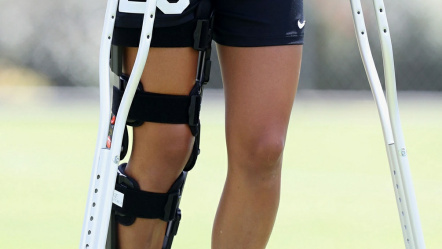 [23] Mann nach Knie-OP mit Stützkorsett an Krücken: