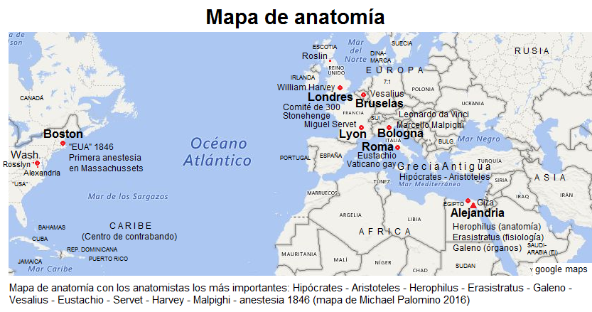 Mapa de anatomía con los anatomistas los más importantes: Hipócrates - Aristoteles - Herophilus - Erasistratus - Galeno - Vesalius - Eustachio - Servet - Harvey - Malpighi - anestesia 1846 [1]