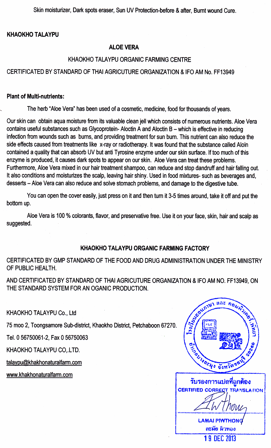 Wundheilung mit Aloe Vera (100%), hier im Glas - Der Beipackzettel auf Thailändisch