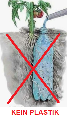 Die PET-Flaschen-Freaks können auch eine PET-Flasche als Bewässerungsrohr einsetzen [web01]. Nur gelangen so Plastik und Weichmacher ins Erdreich, was absolut zu vermeiden ist [4]