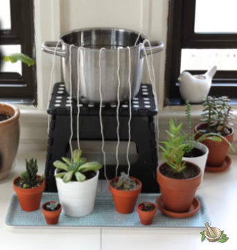 Es ist sogar möglich, mit einer Flasche oder einem Kessel neben der Pflanze und einer Baumwollschnur die Bewässerung sicherzustellen: Die Pflanze zieht sich über die Schnur das Wasser rein [web05]. [Beim Beginn muss die Schnur feucht sein].