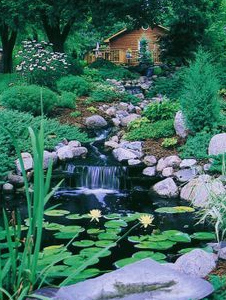 Dreistufige Teichgrube ausgehoben [9] - Teichbau: Schale mit grossen Steinen [10] - Gartenteich mit Steinrand und kleinem Wasserfall [11] - Teich mit Steg [12]