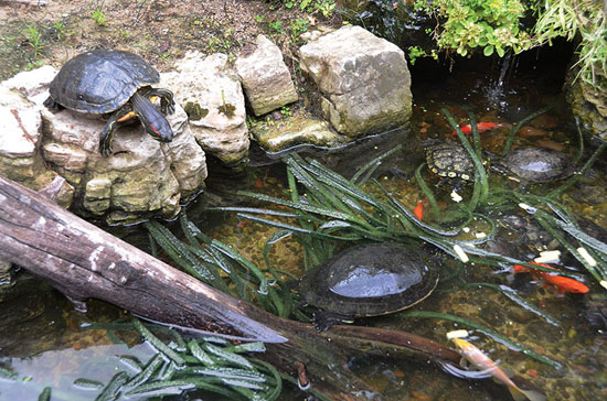 [151] Schildkrötenteich mit sich sonnenden Wasserschildkröten an flachen Ufersteinen: http://turtle_tails.tripod.com/backyardturtles/byttour10.htm