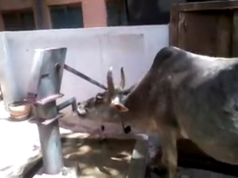 Eine Kuh kann eine Wasserpumpe selbst bedienen: