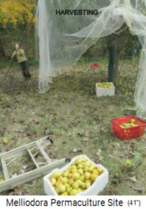 Fruchtbäume auf Melliodora sind: Äpfel, Birnen, Pfirsiche, Pflaumen, Oliven, Feigen, brasilianische Guave (Feijoa), Walnüsse, Mandeln und Haselnüsse. Hühner und Gänse werden in den Obstgarten integriert, Ziegen werden mit elektrischen Zäunen gehalten.