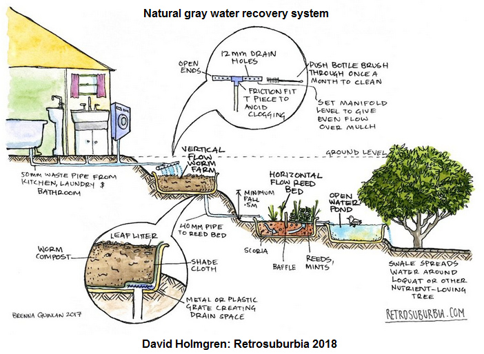 [16] David Holmgren "Retrosuburbia" architecture: gray water recovery system for regions without hard winter: