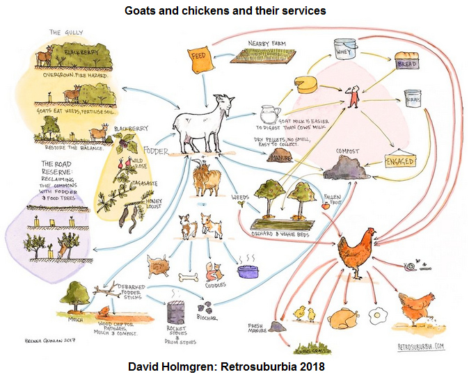 [17] David Holmgren book Retrosuburbia 2018: Goats and chickens and their services, graphic: