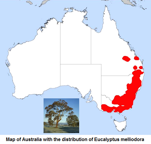 Eucalyptus tree "Eucalyptus melliodora" [12] - Eucalyptus melliodora, leaves and flowers [11] - Map of Australia with the distribution of eucalyptus tree Eucalyptus melliodora [32]