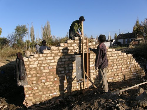 Kirgisistan 2010: Bau eines Walipinis in der Fläche mit Doppelmauern rund rum 01, Seitenmauer mit Fenster [7] -