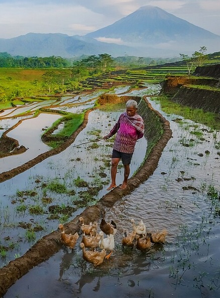 Indonesien, Insel Java, Magelang, Kajoran: Enten im Reisfeld 04, der Reisbauer treibt die Enten vor sich her [4]