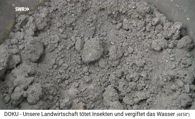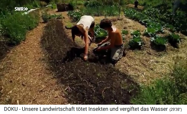 En 1/3 de los campos en Alemania los límites de contaminación por nitratos son superados (42 seg.). Los lodos de depuradora aportan nutrientes, pero también contienen residuos químicos, que salen también en los alimentos (49 segundos). Pesticidas no sólo matan a los animales malos como "plagas". Los fungicidas en particular matan toda la vida en el suelo, y cada vez más malezas están desarrollando resistencias a los herbicidas (1'8''). Los insecticidas también matan muchos insectos positivos (1'21''). "Casi el 75% de los insectos han desaparecido en las últimas décadas, y con ellos casi la misma cantidad de aves." (1'29'') - La erosión también causa la destrucción del suelo de 10 millones de toneladas anuales en todo el mundo (1'38'').
