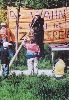 Im Hintergrund ein Transparent: "Der WAHN ist kurz - die REU ist lang - ZOLLFREIE NEIN."