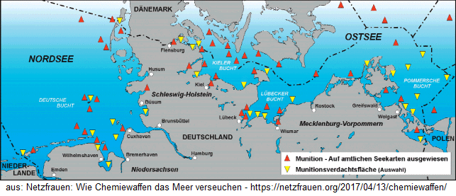 <Sollten Sie noch Fisch verzehren, dann beachten Sie, dass die Gefahr zunimmt, Senfgas-Dorsch oder Arsen-Schollen zu verzehren. In den Weltmeeren tickt eine Zeitbombe: Die Armeen der Weltmächte versenkten zwischen 1917 und 1970 systematisch über eine Million Tonnen Chemiewaffen aus den beiden Weltkriegen in den Ozeanen, in Seen und im Erdboden.Die in der Nord-und Ostsee versenkte Munition rostet seit Jahren vor sich hin. In der Nord- und Ostsee liegen seit 70 Jahren Bomben aus dem Zweiten Weltkrieg. Jahrzehntelang hat sich niemand darum gekümmert. Die Bomben im Meer zu belassen birgt viele Risiken.