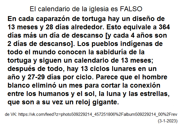 En cada caparazón de tortuga hay un diseño de 13 meses y 28 días alrededor. Esto equivale a 364 días más un día de descanso [y cada 4 años son 2 días de descanso]. Los pueblos indígenas de todo el mundo conocen la sabiduría de la tortuga y siguen un calendario de 13 meses; después de todo, hay 13 ciclos lunares en un año y 27-29 días por ciclo. Parece que el hombre blanco eliminó un mes para cortar la conexión entre los humanos y el sol, la luna y las estrellas, que son a su vez un reloj gigante.