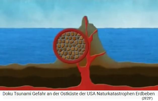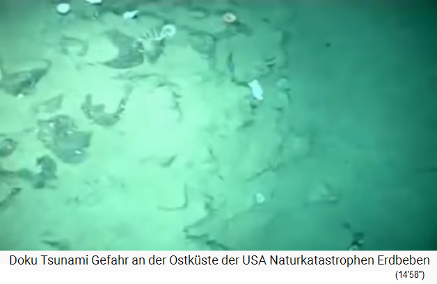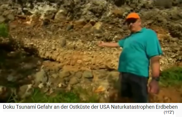 En el fondo del mar, los campos de escombros frente a Hawai bajan hasta a una profundidad de 4000m (8'38''), por lo que las rocas que cayeron allí son en parte. roques tan altas como una casa (8'43''). El tsunami golpeó la isla de Lanai, 160 km al norte, el tsunami fue de 180 a 300 m de altura, estas altas olas del tsunami actuaron como lluvia, no solo con agua de mar, sino también con rocas grandes del fondo marino, con peces, algas, conchas y arena (9 '18' '). Entonces, hay capas terrestres que se pueden fechar con precisión, y ahora se puede concluir qué pasaría si una ola gigante golpeara la costa este de los "EUA" (9'40'').