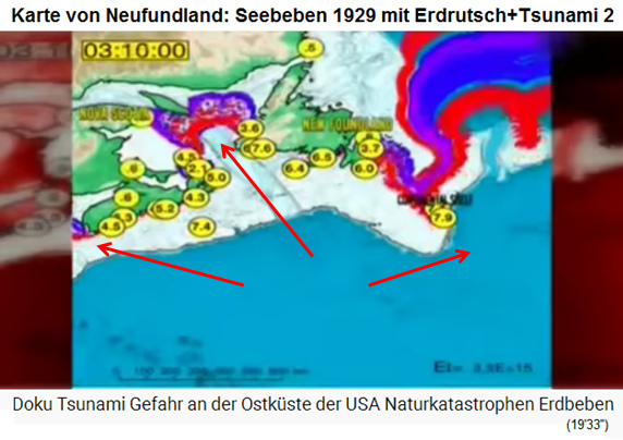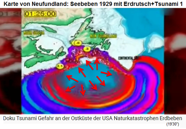 Los tsunamis de deslizamientos de tierra que han afectado a Norteamérica son: el tsunami de Grand Banks de 1929 en el este de Canadá (18'38''), el tsunami de Newfoundland Bank: primero hubo un terremoto con una magnitud de 7.2, luego vino el deslizamiento de tierra en el fondo del océano, luego vino el tsunami (19'23''). La ola del tsunami puede alcanzar la misma altura que el propio deslizamiento de tierra (19'31''). Además, el deslizamiento de tierra también cortó los cables transatlánticos de N- "América" a Europa (19'43''), los cables blindados se cortaron como hilo (19'54''). Luego, el tsunami se fue en dirección a la península New In [?] en el territorio de Canadá, 800 km rápido (20'9''). La ola se ralentiza cerca de la costa, al mismo tiempo aumenta su altura (20'15''). 50 km de costa fueron afectados, 27 muertos, 10,000 casas destruidas (20'38'').