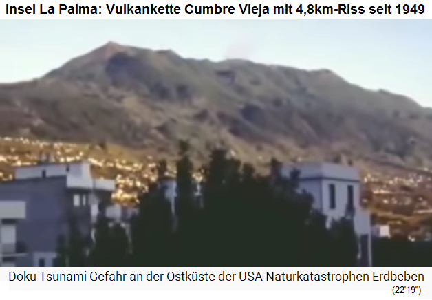 La erupción volcánica en La Palma de 1949 duró meses, hubo muchos flujos de lava, hubo nuevos cráteres, el sur de la isla sufrió muchos terremotos ya (9'43''). En 1949 el cráter "Hoyo Negro" quedó como reliquia (9'50''). Otras señales alarmantes son: El flanco occidental ya bajó hacia el mar, parece ya separado del resto de la isla (10'23'').