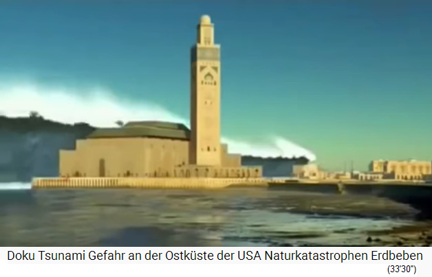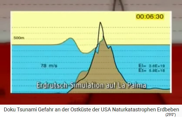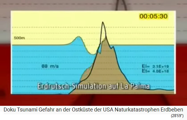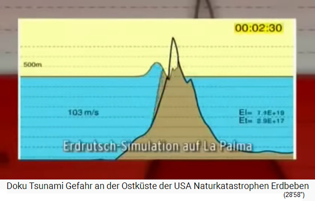 El cálculo del tsunami: En la Universidad Estatal del estado federal de Oregon hay un laboratorio de pruebas con un simulador de tsunamis (1'36''). Los tsunamis son peores o menos graves según el tipo de activación (2'16''). Los tsunamis provocados por terremotos como el de Sumatra en Indonesia provocan olas largas y separadas que retienen su poder durante más de 1000e km (2'44''). Un deslizamiento de tierra en el mar provoca ondas de onda corta, la opinión de investigación general anterior afirma que las ondas de onda corta se extenderían en todas direcciones y perderían su poder al cruzar el Atlántico (3'2''). Luego fue simulado el escenario de La Palma en el simulador de la Universidad de Oregon (3'10''): El resultado fue un tsunami gigantesco tan alto como nunca antes, por lo que todo el flanco occidental cae al mar a gran velocidad, eso provoca una ola muy alta, la ola se calcula en el simulador a una altura real de 1 km (4'0''). Esta gran ola se dividirá en una serie de olas más pequeñas que ya no serán tan fuertes (4'12''). La costa este de los "EUA" se verá afectada por algunos tsunamis que no serán tan fuertes como la ola original en La Palma (4'26''). La altura del tsunami será de unos pocos pies, ya no será catastrófica (4'35''). Pero las otras islas Canarias van a sufrir mucho (4'42'').