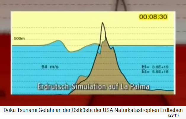 La causa del tsunami contra la costa este de "EE.UU." es el volcán de la isla de La Palma, una isla de las Islas Canarias cerca de la costa africana, las islas pertenecen a España (2'12''). La isla de La Palma tiene una cadena volcánica activa llamado "Cumbre Vieja" (2'17''). [Lo largo de esta cadena volcánica] en la isla se ha formado una grieta de casi 5 km de largo del norte al sur (2'35''). Si el volcán entrara en erupción, una parte entera de la isla podría desprenderse y caer al mar, la parte del flanco volcánico en cuestión tiene 16km de largo y 1600m de alto (2'55''). Esto podría desencadenar una ola marina (tsunami) con una altura inicial de 300 m (3'0'').