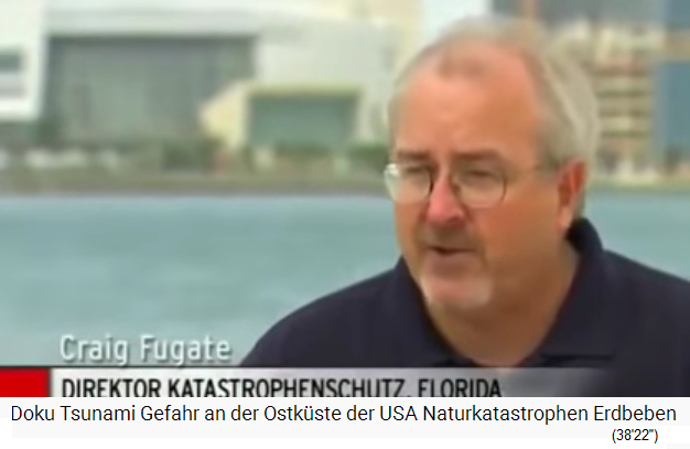 El tsunami de La Palma puede llegar a la costa este de los "EE.UU." en 10 horas, saldrá un tsunami de 25 m de altura en Boston, Nueva York, Miami (3'45''). El Sr. Craig Fugate (Director de Protección Civil de Florida): Este será un evento global con repercusión mundial (4'0'').