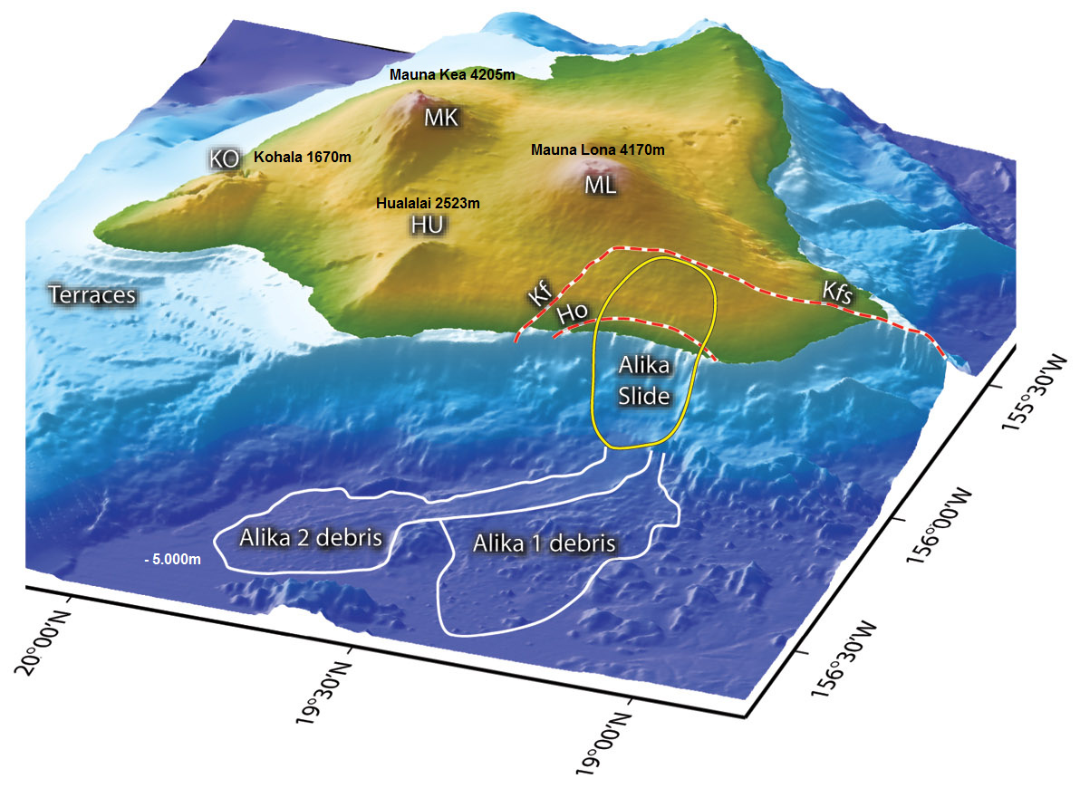 Los deslizamientos de tierra alrededor de Hawai ahora han sido mapeados, dijo el geofísico marino Dr. John Smith de la Universidad de Hawái dice: Primero se toman las medidas desde arriba con un sonar desde un barco, luego llega un pequeño submarino, luego se toman muestras (7'8''). Así es como se crean los mapas con los deslizamientos de tierra, y es posible sacar conclusiones sobre deslizamientos de tierra y tsunamis anteriores (7'42''). Primero fue el deslizamiento de tierra con el tsunami de Nu'uanu (un deslizamiento de tierra en el fondo del mar [web03]), luego dos deslizamientos de tierra siguieron desde la isla principal: Alika 1 hace 240.000 años y Alika 2 hace 120.000 años (cayeron flancos enteros del Volcán "Mauna Loa" hacia el mar [web02]) (8'0''). Ambos fueron provocados por deslizamientos de tierra en la costa oeste de la Isla Grande (8'5''). Dos veces más cayeron más de 2000 km3 de roca al mar (8'20'').