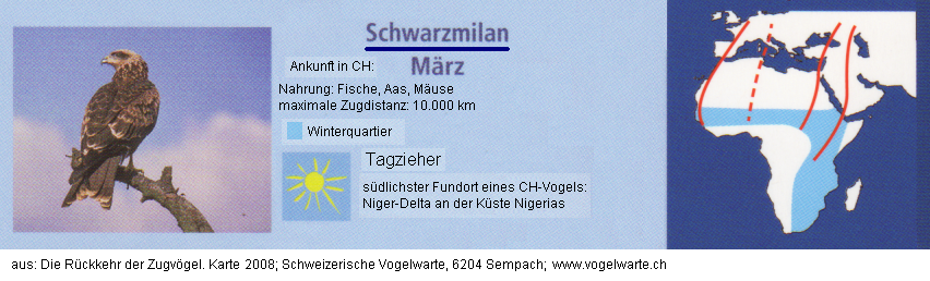 Schweiz selten nur zur Zugzeit sichtbar (Bd.II, S.94); März/Apr.-Aug./Okt., im Winter in S-Eur. u. Afrika; das Brutzentrum als Standvogel ist am Mittelmeer (Bd.II, S.94); Rohrweihen sind so gross wie Bussarde, ist die stärkste Weihe, mit schnittigerer Flügelform als Bussarde, Flügel höher gehalten als beim Bussard (Bd.II, S.94) |