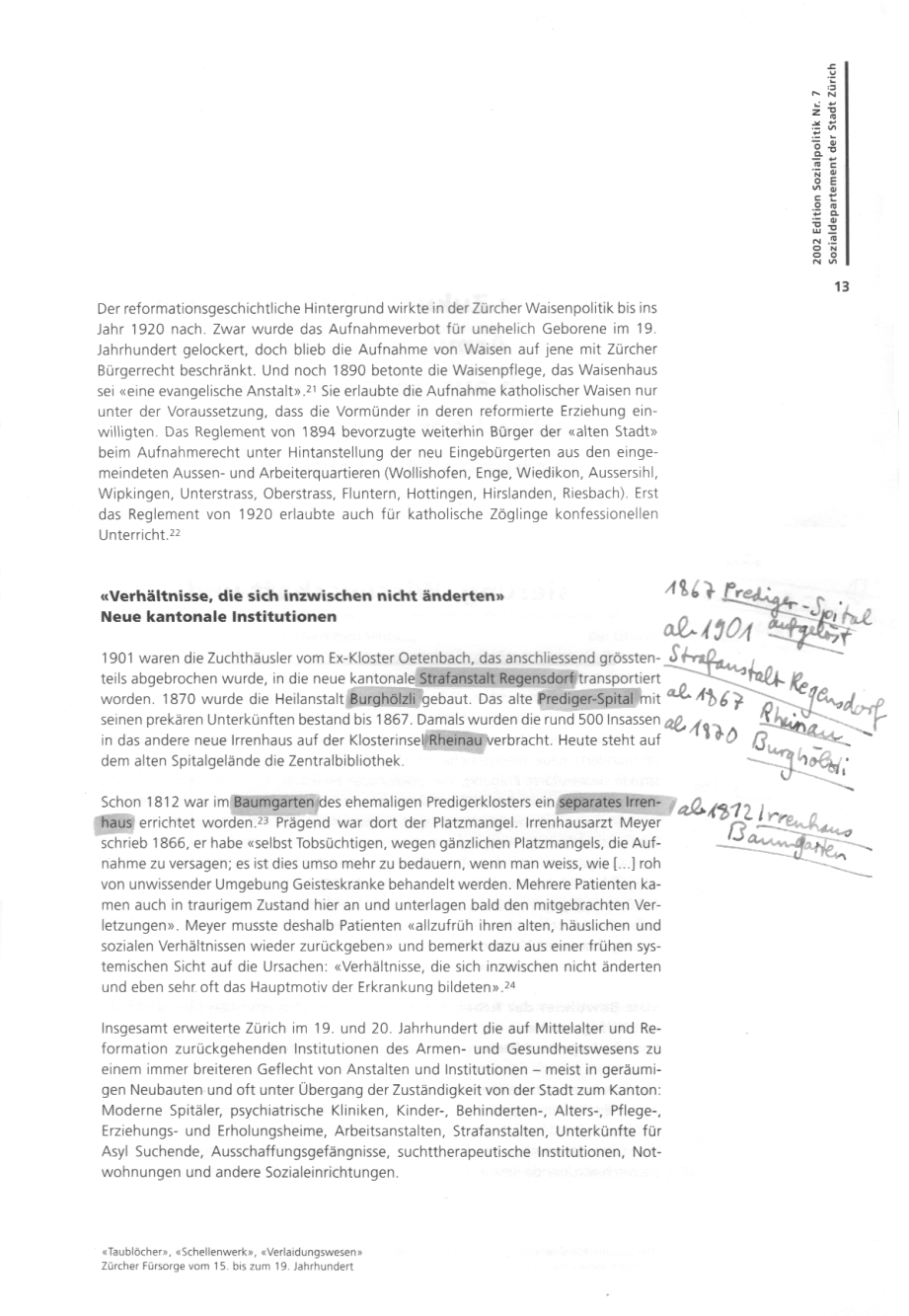 (Endnote 13: Vgl. Denzler 1925, Jugendfürsorge, S. 127; Mörgeli 2000, Spital, S. 37)