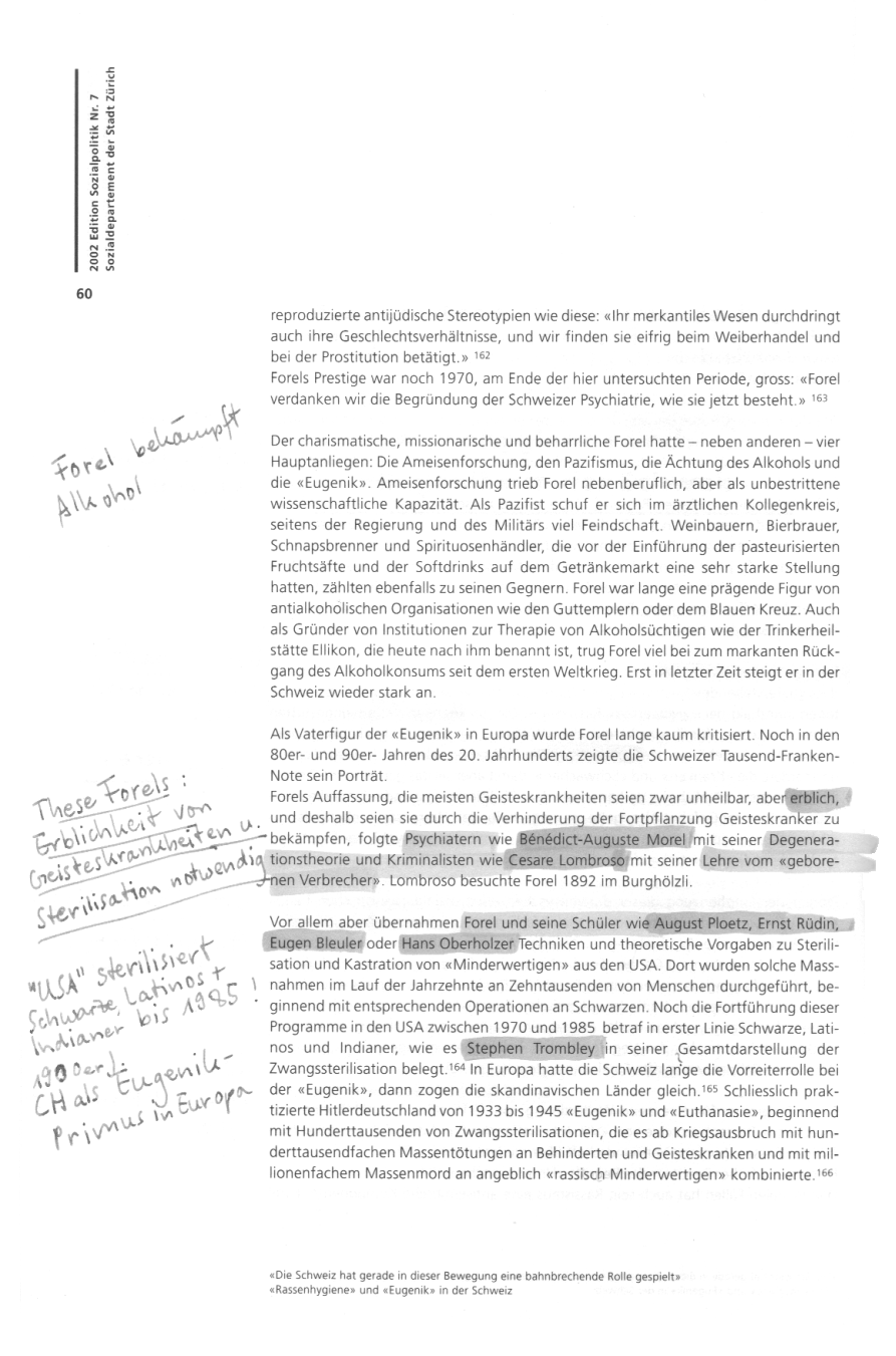 [Forels Tätigkeitsfelder: Ameisen, Pazifismus, Alkoholsucht, Eugenik mit Erblichkeitsthesen und Sterilisationen - Morel mit "Degenerationstheorie" und Lombroso mit dem "geborenen Verbrecher"]