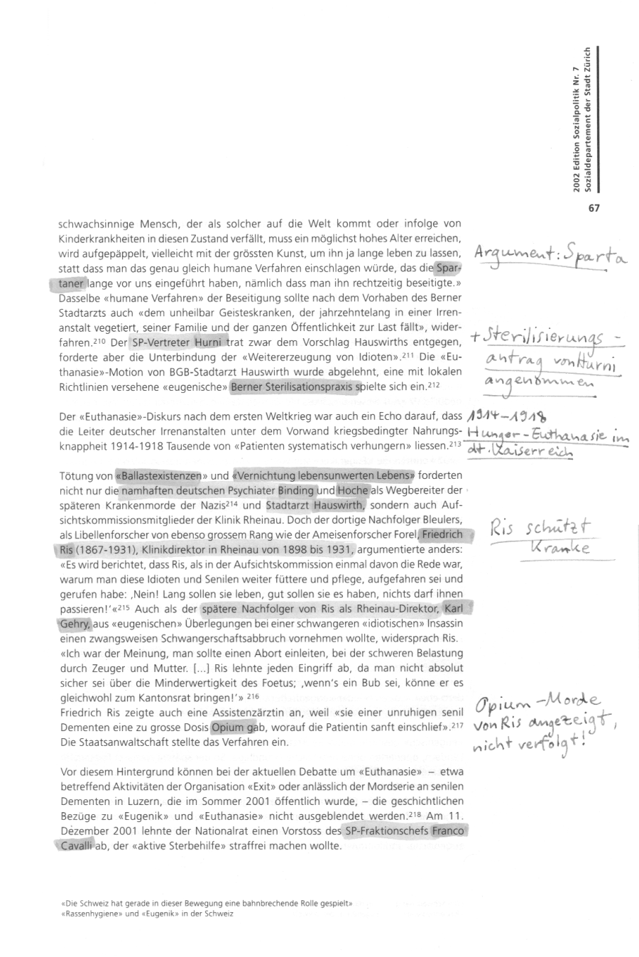 Auch "Euthanasie" blieb in der Schweiz nach 1945 ein Thema. Fritz Hauser distanzierte sich in seiner juristischen Zürcher Dissertation von 1952 von den Krankenmorden im Dritten Reich, erwähnt aber die Berner "Euthanasie"-Debatte von 1923 nicht. Hauser plädierte für "Euthanasie" im Sinne von "Sterbehilfe" an Schwerkranken, wie sie in jüngerer Zeit "Exit" und ähnliche Vereine mit wachsender Anhängerschaft unter Ärzten und Politikern propagieren und praktizieren.