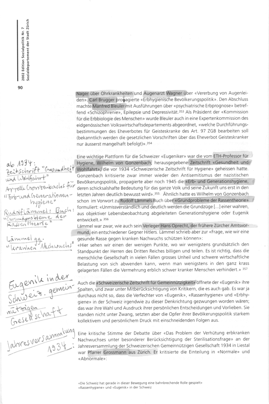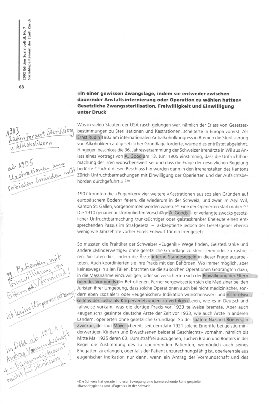 Schon in den bisherigen Zitaten aus Akten und Verlautbarungen der Zürcher Fürsorge finden sich Eheverbote und Hinweise auf amtlichen Druck Richtung Sterilisation, Schwangerschaftsabbruch und Kastration im Zeichen der "Verhütung minderwertigen Nachwuchses". Zum Verständnis dieses Diskurses mit den Leitbegriffen "Eugenik=Rassenhygiene"