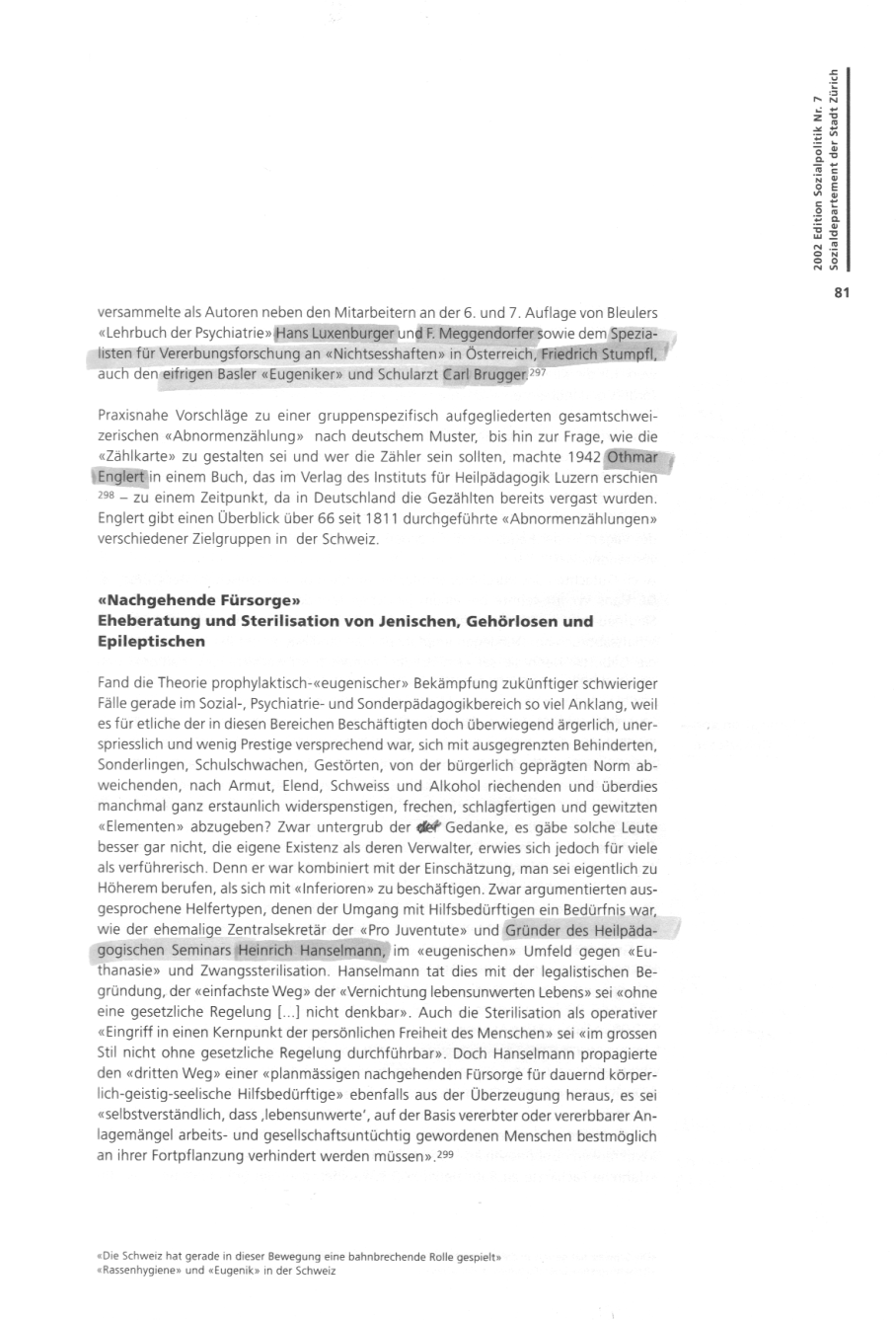 Thomas Huonker: "Fürsorge" in Zürich 1890 bis 1970; Sozialdepartement der Stadt Zürich 2002, S. 80