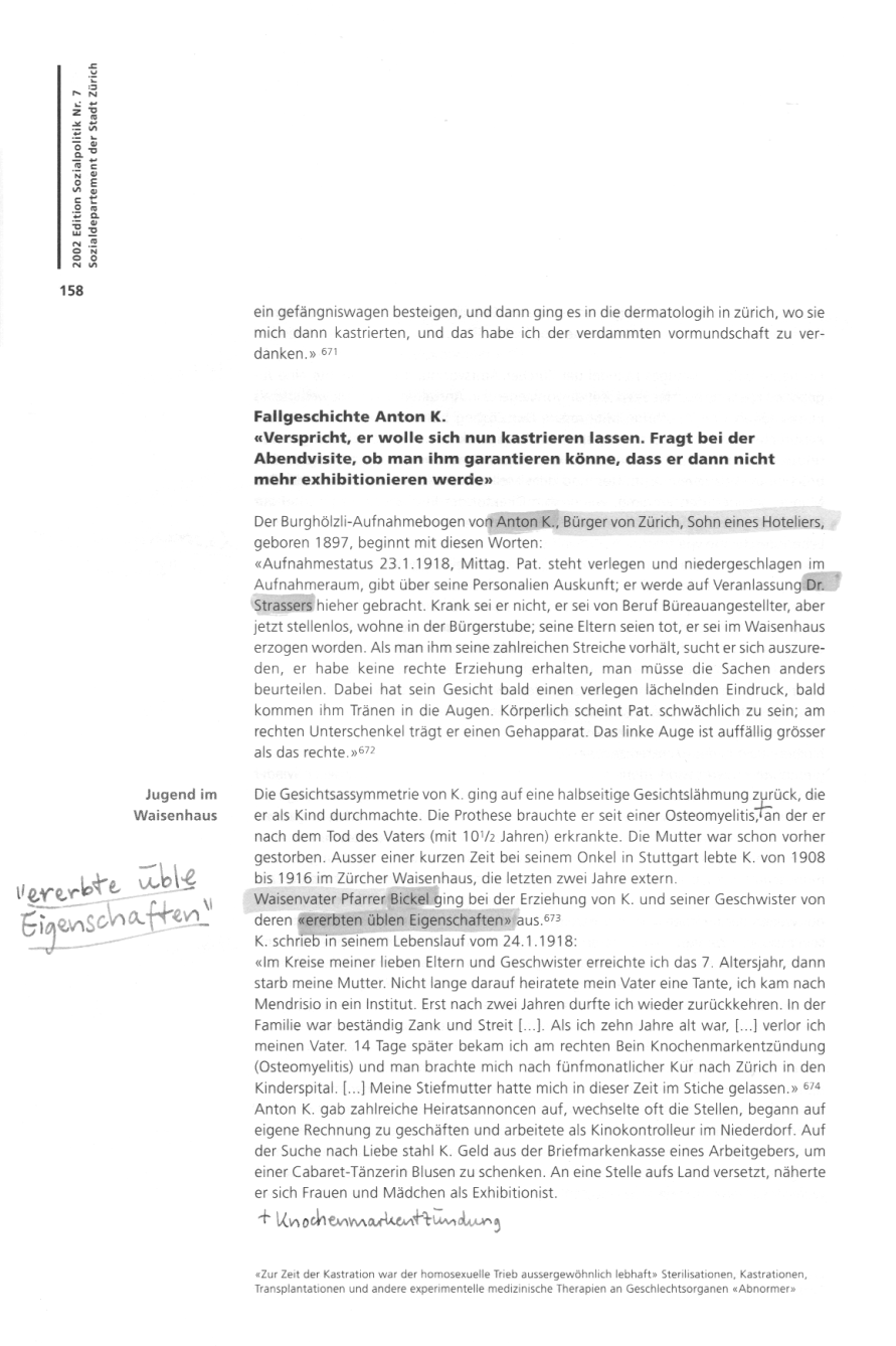 Diagnose: Wahrscheinlicher Rückfall in Exhibition bei kastriertem, hysterisierendem Psychopathen. Kann von uns jederzeit entweder in Untersuchungshaft oder auf freien Fuss entlassen werden. [...] Nach telefonischer Rücksprache mit der Sittenpolizei wurde Pat. noch heute Nachmittag von der Sittenpolizei abgeholt. Am Abend erhielt ich ein Tel. des Pat., worin er mitteilte, dass er nach einer kurzen Einvernahme auf freien Fuss entlassen worden sei. Pat. bedankte sich weitschweifig für die ihm zuteil gewordene Pflege und betonte, dass im Burghölzli doch nicht mehr die unmenschlichen Methoden herrschen wie vor 20 Jahren."