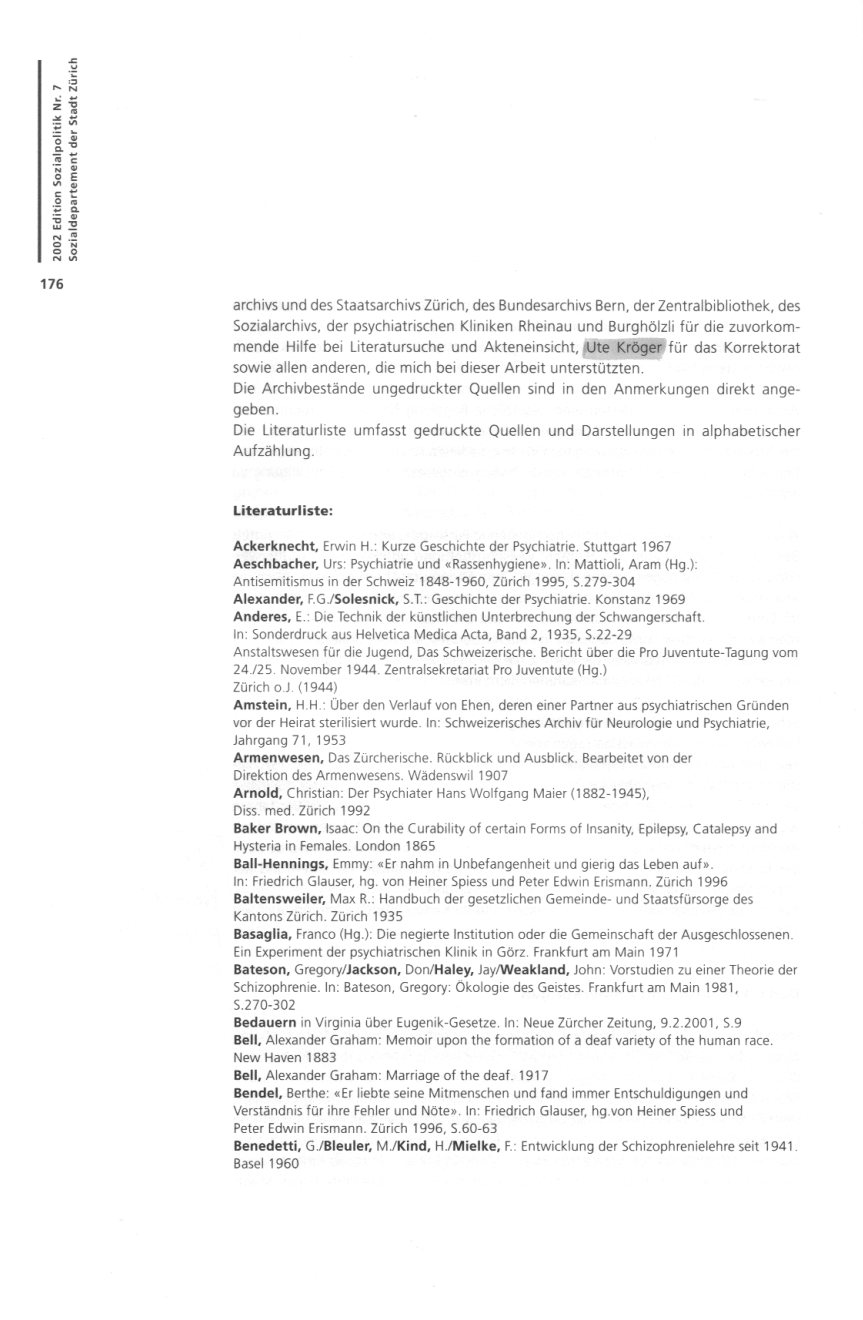 Thomas Huonker: "Fürsorge" in Zürich 1890 bis 1970; Sozialdepartement der Stadt Zürich 2002, S. 176