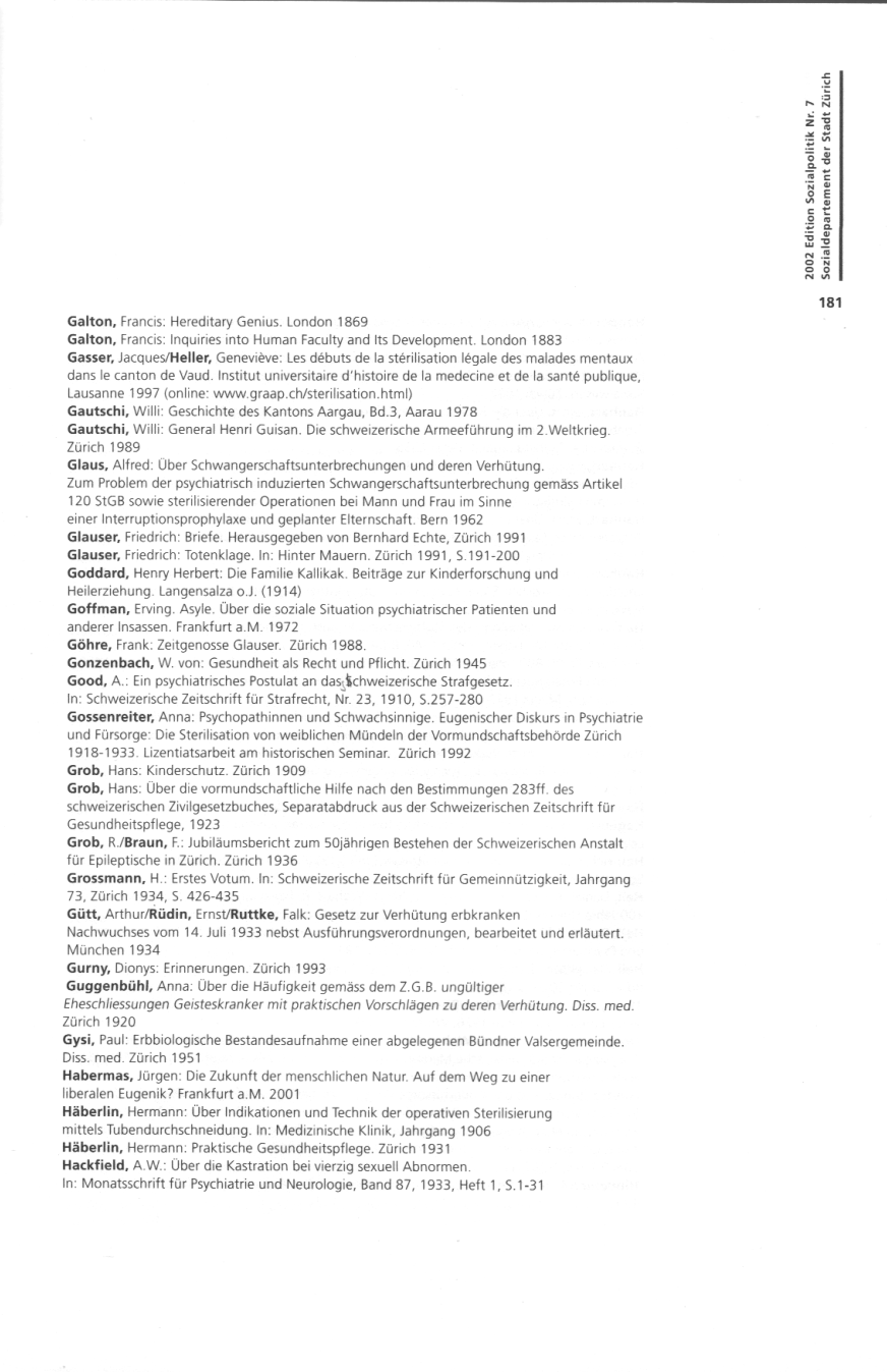Thomas Huonker: "Fürsorge" in Zürich 1890 bis 1970; Sozialdepartement der Stadt Zürich 2002, S. 181