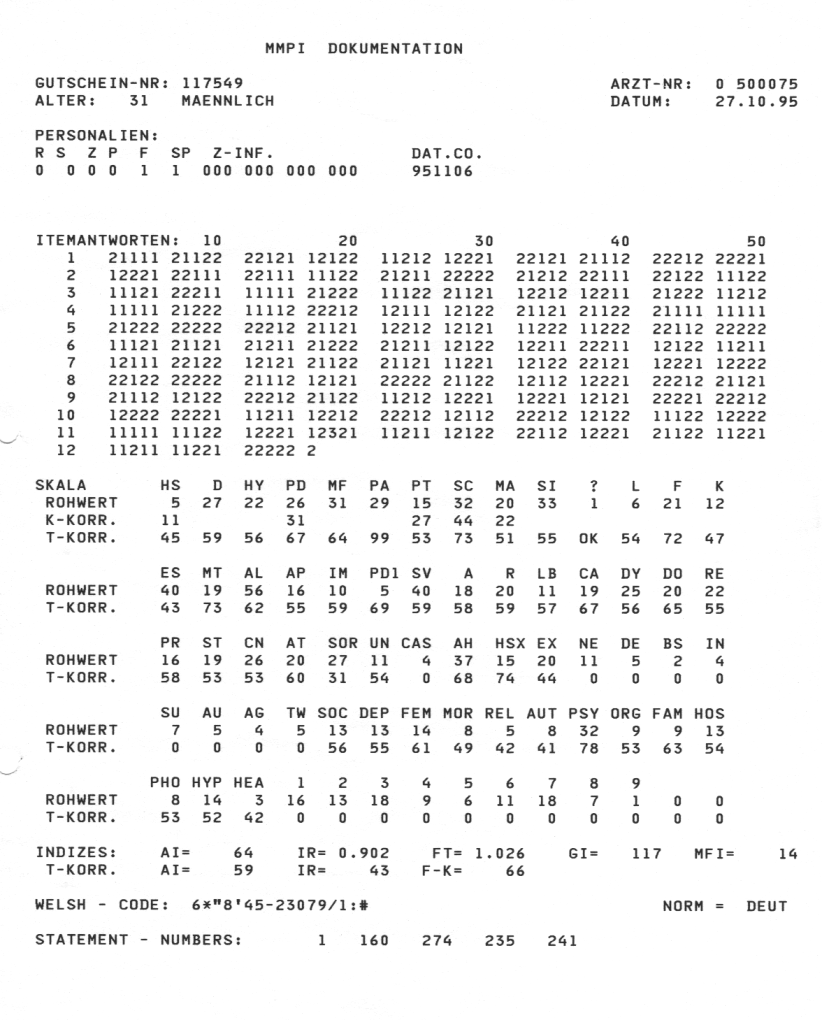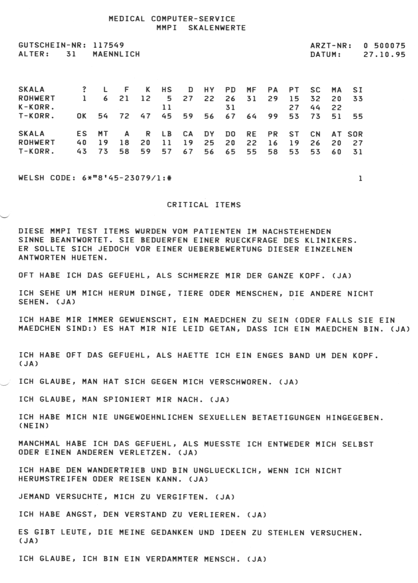 Ihr Computer bewertete mich als schizophren (elektronisch ausgewerteter Test) und Sie haben diese These gegenüber meiner Person in direktem Gespräch unterstützt. Was Sie meinem Vertrauensarzt gegenüber gesagt haben, entzieht sich meiner Kenntnis.