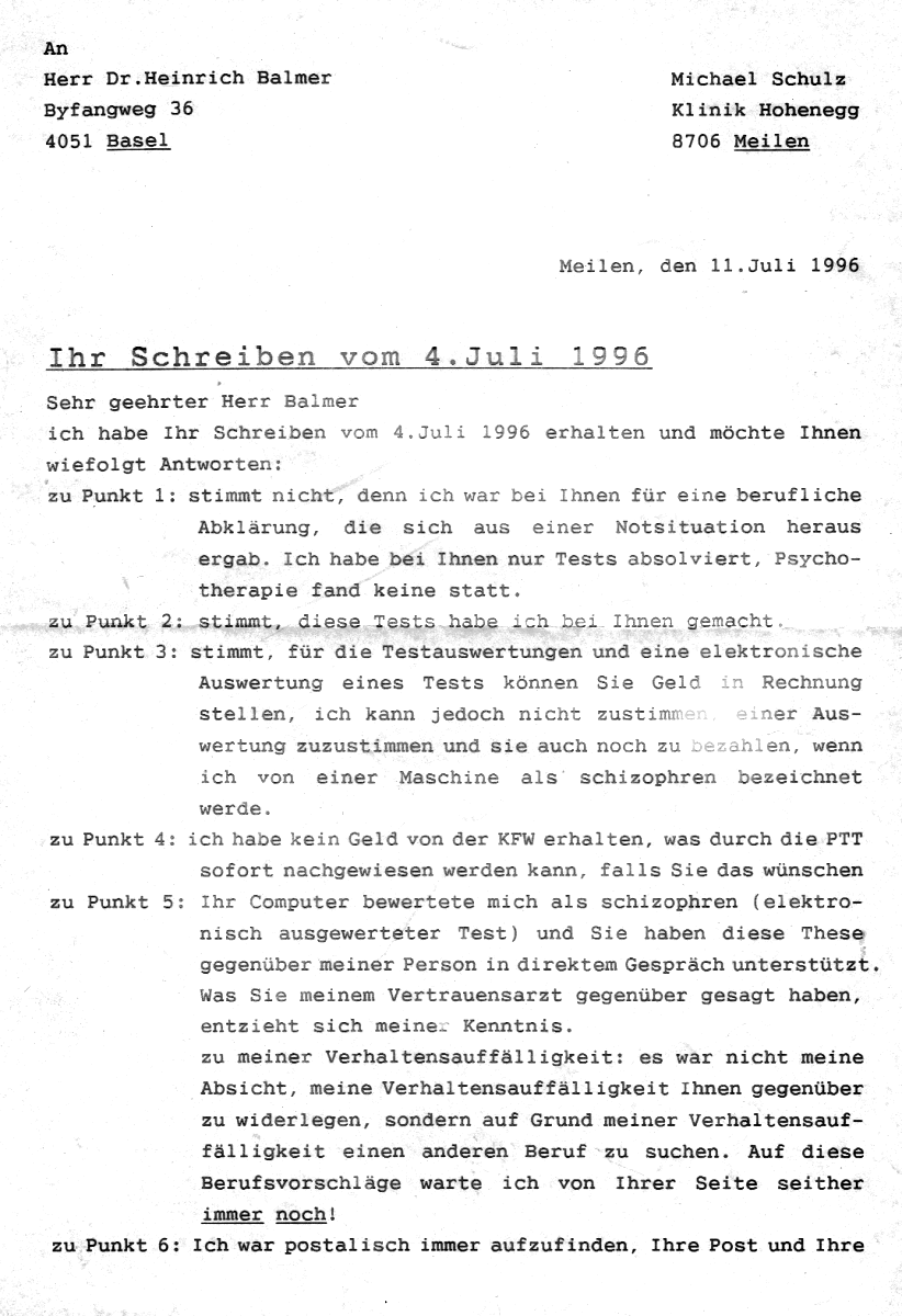 Ich wollte eine Berufsberatung haben, und dann kam das dabei heraus. Am 31. Januar 1996 sollte ich arbeitslos werden. Es ergab sich kein Berufsvorschlag von Herrn Balmer, sondern ich landete hilflos in der Psychiatrie in Meilen, in der "Hohenegg". Herr "Berufsberater" Balmer hatte mir Schizophrenie und Verhaltensauffälligkeit attestiert und meinte, ich sollte weiter Geigenlehrer bleiben und 3 Jahre bei ihm in Psychotherapie gehen. Er wollte nun sein Honorar für die Tests und schrieb mir für seine Nicht-Leistung einen Zahlungsbefehl von 1000 Franken. Darauf gab es nur eine Antwort: Herr Balmer hatte seine Aufgabe nicht erfüllt, weder als Berufsberater, noch als Psychologe: