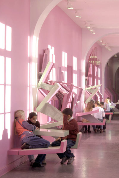 Im Baupilotensprech heisst die Schule jetzt "Heimat des Silberdrachens". Früher unterstützte das 1915 erbaute wilhelminische Schulgebäude eine Pädagogik der Einschüchterung. Heute herrscht dort "Hauchsanftsein". So nannten die Kinder die rosa und pink gestrichenen Flure, wo an der Decke flatternde Lamellen aus Gaze ein duftiges Gefühl verbreiten.