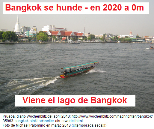 Desde abril 2013 - desde he visto esa noticia de la capital de Bangkok que se hunde en la prensa del diario "Relámpago Semanal" (original alemán: Wochenblitz) - yo estoy advirtiendo (indican los datos satelitales justamente que en 2020 la ciudad completa va a ser en 0m, y partes grandes ya están bajo 0 hoy), pero los servicios secretos y los comandantes y gobiernos no actúan nada pero simplemente siguen tomando alcohol y siguen manejando sus burdeles y ¡siguen riendo a la gente que están hundiendo!