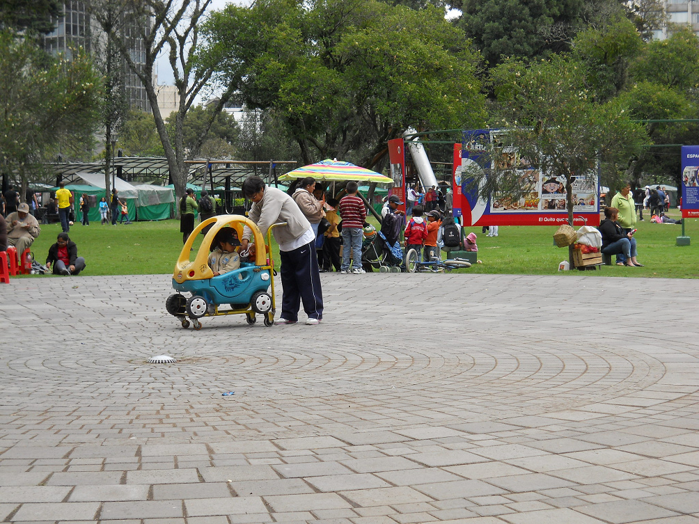 [33] niño de 2 a 5 años manejando su primer auto / coche empujado por una persona grande, parque Ejido en Quito en Ecuador: foto de Michael Palomino 2012