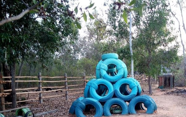 -- Klettern 10a: Pyramide aus vertikalen, bemalten Autoreifen: https://sustainable-autonomy.weebly.com/blog/discover-auroville-sadhana-forest